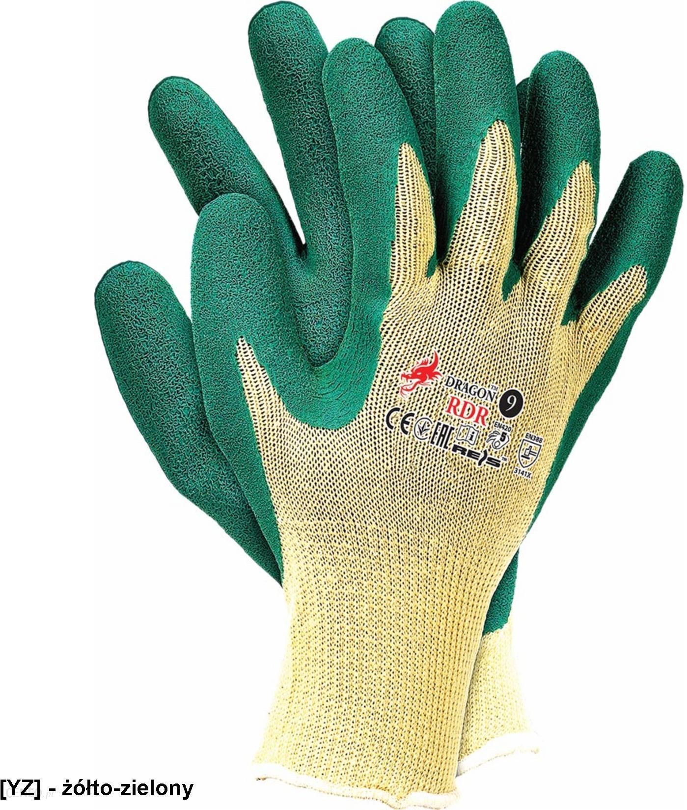 RDRRękawice ochronne wykonane z dzianiny, powlekane. wysoka jakość dzianiny (ścieg 10) gwarantuje komfort użytkowania.Powlekane bardzo wytrzymałą gumą o porowatej strukturze, dzięki czemu zachowują świetną przyczepność, przy czym nie tracą swojej elastyczności.Zakończone ściągaczem.Trudnościeralne i odporne na zużycie.Odporne na rozdarcie i powstawanie pęknięć.Stosowane w budownictwie oraz przemyśle transportowym.Wytrzymałość i wysoka jakość gwarantują zadowolenie użytkowników.Zgodne z normami EN388 (poziomy odporności: 3 1 4 1 X) oraz EN420.